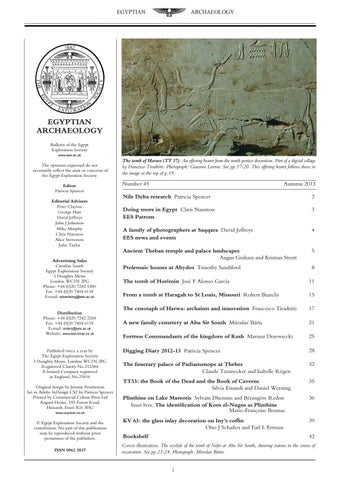 The opinions expressed do not necessarily reflect the aims or concerns of the Egypt Exploration Society Editor Patricia Spencer Editorial Advisers Peter Clayton George Hart David Jeffreys John J Johnston Mike Murphy Chris Naunton Alice Stevenson John Taylor Advertising Sales Caroline South Egypt Exploration Society 3 Doughty Mews London WC1N 2PG Phone: +44 (0)20 7242 1880 Fax: +44 (0)20 7404 6118 E-mail: advertising@ees.ac.uk Distribution Phone: +44 (0)20 7242 2268 Fax: +44 (0)20 7404 6118 E-mail: orders@ees.ac.uk Website: www.ees-shop.co.uk