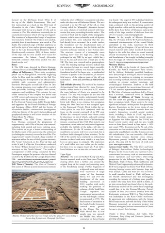 Upper Egypt Amarna: The team led by Barry Kemp and Anna Stevens resumed work at the Great Aten Temple, all_current_projects/naukratis_the_greeks_in_egypt.aspx clearing debris from a further area around the Tell Timai (Thmuis): The Univ of Toronto’s original front of the temple and removing more first season at Thmuis (a semi-autonomous mission of the Pendlebury dumps. Further fragments of sculptured stone and statues were recovered. A single course of fine limestone blocks was laid over the foundations of the stone building uncovered in 2012, together with circles marking the positions of columns. At the Small Aten Temple, inspection and maintenance was carried out on the full-height column reconstructed in 1995. The final season of excavation at the South Tombs Cemetery covered more ground at the Upper Site and Wadi Mouth Site. A new sample area was opened, Amarna: The front part of the Great Aten Temple (end of the spring 2013 season) looking to the Middle Site, where a the east along the temple axis. Photograph: Gwil Owen contracted or flexed burial