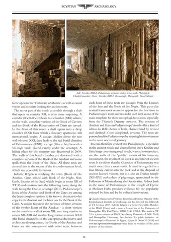q Claude Traunecker is Professor Emeritus and former Director of the Egyptological Institute in Strasbourg, and has directed the fieldwork at TT 33 since 2004. Isabelle Régen is a former Scientific Member at the IFAO (Cairo) and is now a Researcher at the University of Montpellier III - Paul Valéry, UMR 5140 CNRS. The work at TT 33 is a joint mission of IFAO, Strasbourg University (UMR 7044) and Montpellier University. See further: ‘Le palais funéraire de Padiamenopé redécouvert’ in Egypte, Afrique & Orient 51 (2008) and www.ifao.egnet.net/archeologie/tt33/ with links to websites of the joint partners of the mission.