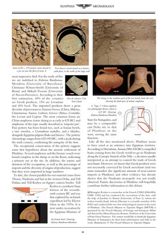 State for Antiquities, and may be a comparable east Delta site to that of Plinthine in the west, serving the same function. Like all the sites mentioned above, Plinthine seems to have acted as an entrance into Egyptian territory. According to Herodotus, Amasis (580-526 BC) compelled boats coming from the Greek world to go to Naukratis along the Canopic branch of the Nile - a decision usually interpreted as an attempt to control the trade of Greek merchants. However, we know that Greek products were not necessarily conveyed by Greek merchants (and one must remember the significant amount of near-eastern imports at Plinthine) and other evidence has already shown that the Naukratis monopoly was not totally observed. Future discoveries at Plinthine will hopefully contribute further information to this debate. q Bérangère Redon is a researcher at the French CNRS (HiSoMAUMR 5189) and has conducted the excavations of the kom, with the help of Joachim Le Bomin (University of Paris 1), whom the writers warmly thank. Sylvain Dhennin is a scientific member of the IFAO and conducted the two first archaeological seasons in the town of Plinthine. The French Mission to Taposiris Magna (MFTM) is sponsored by the French Ministry of Foreign and European Affairs and directed by Marie-Françoise Boussac, Professor at the University of Paris Ouest Nanterre. The writers would like to thank the Egyptian Ministry of Antiquities for their kind authorisation and help in the work. Illustrations: © The French Mission to Taposiris Magna.