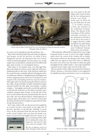 top cross band on the left begins with ‘revered’ (as does the far less well-preserved bottom cross band). ‘... revered, may I see Re [in the sky and drink from the pool …]’ In neither instance is there any mention of the traditional mortuary deities. The absence of the usual figure of Nut and her customary recitations on the end panels or elsewhere on the lid or box leads us to suggest that Iny’s coffin inscription was made during the Amarna Period as the The face mask of Coffin A of the Royal Nurse, Iny, showing glass eye inlays and composition eyebrows. usual ‘traditional’ funerary Photograph: Mary Ann Marazzi deities were not invoked. Obviously this coffin had been subjected to some rough its owner can be identified as the Royal Nurse, Iny. treatment before it came to rest in our single chamber Most of the individual inlaid elements of the inscriptions tomb where the action of the termites led to further and designs on the lid and box of coffin A have deterioration. However, the damage to the surface of this disappeared and the cut depressions that once housed coffin does not appear to have been done to obliterate coloured inlaid hieroglyphs and decorations are mostly the name of its owner, Iny, but rather to obtain the gold empty; they would almost certainly have been filled with leaf applied to the coffin’s surface - tiny scraps of gold foil glass, paste or paint, or even Egyptian faience. remained on the surface after removal of the resin. Glass inlays in situ include some very thin light blue We do not know if the coffin was used for Iny’s burial (at glass rods and pieces of them on the right side of the box, Thebes, Amarna, or elsewhere) before it was stripped of marking borders to the texts. They had been inlaid into its valuable decoration and chosen to serve as a repository the incised borders, probably affixed with Egyptian blue or similar paste adhesives. Neighbouring rods dropped out of their original positions when the wood dried out and warped or the surrounding wood was eaten by termites. More glass rods were found among the debris in and near the coffin, along with flakes of gold. A partial list of glass elements besides the blue glass rods includes a broken red glass ›hieroglyph, practically encircled by gold leaf, on the left side of the box, in the third cross band, and a complete turquoise-blue nb sign, on the left side of the box, second column from the top just before the start of Iny’s title, mnat nzwt (Royal Nurse). Small fragments of turquoise glass, still in place, have also been noted, plus the shattered left end of a red glass mn sign under the blue nb sign discussed above. Iny’s name and/or title are also preserved (completely or in part) on three cross bands on the right side of the box, and three on the left side. Similarly, it occurs twice on the end panel of the lid and near the bottom of the central column. One text, from the fourth cross band, was preserved and legible from the twenty or so pieces remaining of this coffin (not counting the many tiny fragments and pieces) that were eaten by termites. The Blue glass rod fragments used for text borders. Photograph: Heather Alexander