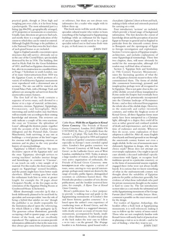 practical guide, though at 24cm high and weighing just over a kilo, it is far from being a pocket-guide. The most substantial part is a listing (pp.88–290), geographically arranged, of 51 properties or monuments or cemeteries. Usually, basic directions are given to find each, and mostly there is a rough indication of the extent to which they can be visited or entered. Although English Heritage is the publisher, it is the National Trust that owns the lion’s share of such grand houses as are included. Egypt in England naturally concentrates upon structures that still survive: obviously not so in the case of the Crystal Palace, spectacularly destroyed by fire in 1936. The building, first sited in Hyde Park for the Great Exhibition of 1851, itself had no Egyptian characteristics, but, after its reconstruction in a modified form at Penge / Sydenham in south London, one of its main visitor-attractions from 1854 was the Egyptian Court, in which portions of a variety of well-known Egyptian monuments were reproduced with a determined aim at accuracy. The site can still be visited as the Crystal Palace Park, with a Heritage Trail, and sphinxes are among the sad survivors from the nineteenth-century features. The first half of the book contains a sequence of seven essays, each devoted to a theme or to a type of material: architecture, cemeteries, cinemas, ‘Egyptiana’, Egyptology, Freemasonry, and hieroglyphs. How interesting and useful readers may find them will necessarily vary according to their existing knowledge and interests. The reviewer can only indicate a couple of his own reactions: the essay on ‘Cinemas: the splendour of Luxor’, although the shortest, paints - together with the accounts of the Carlton Cinema (Islington) and the Pyramid (Sale, Greater Manchester), both surviving, at any rate as buildings - a vivid picture of the brief vogue for cinemas with Egyptianising exteriors or interiors and its place in the very peculiar history of cinema-buildings. ‘Egyptiana’ is Elliott’s word for ‘the more decorative aspects of the Egyptian style’ and the essay ‘Egyptiana: silver-gilt services to sewing machines’ includes interior design and furnishings; in contrast to ‘Cinemas’, it can touch on only a tiny sample of its material. For this reader, the short essay (eight pages) on ‘Egyptology’ seemed breathless, and the points might have been better made elsewhere. Elliott’s writing goes best when his enthusiasm leads him to write at greater length: for example the 38 pages about Cleopatra’s Needle, or the five pages on the restoration of the Egyptian Dining Room at Goodwood House (Chichester). Elliott disarmingly concedes (p.5) that a book deliberately planned to be used both by specialists and non-specialists ‘runs the risk of being a hybrid that satisfies no one’ though the publisher is no doubt responsible for the limitations placed upon the referencing, for which Elliott is a little apologetic (p.5). The generous colour illustrations, generally occupying a half or quarter page, are a major feature of the book, and are excellently reproduced. The captions on occasion provide information additional to that in the main text; they always give some form of picture-credit