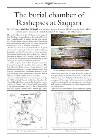 The burial chamber of Rashepses at Saqqara In 2012 Hany Abdallah El-Tayeb was awarded a grant from the EES Centenary Fund, which enabled him to excavate the burial chamber of the Saqqara tomb of Rashepses. The tomb of Rashepses (LS16), dating to the reign of King Djedkare, is situated just to the north of Djoser’s Step Pyramid complex at Saqqara and has been known since the early 1800s. However, a large part of the mastaba had remained unexcavated until 2010 when I re-started archaeological work at the tomb for my PhD. Neither the burial chamber of the tomb nor its point of access are mentioned in previous studies (Lepsius, Denkmäler, pp.165-170, pls 60-64; Porter & Moss, Topographical Bibliography III2, pp.494-496; Quibell, Excavations at Saqqara (1907-1908), pp.23-24, pls 60-61.2) so one of the aims of the renewed exploration was to investigate the tomb-owner’s burial apartment. In 2010, a square shaft (1.90m along each side) was found in the area north-west of the false-door room. The shaft fill consisted of a mixture of local limestone, sand and fragments of pottery, with a few human bones. At a depth of 11m an entrance led from the south wall of the shaft into a large burial chamber which measures 5.4m x 5.0m, is 2.5m high and has painted decoration. Painted burial chambers are known at Saqqara from the late Fifth/early Sixth Dynasty but Rashepses’ tomb, of the reign of King Djedkare, seems to be the earliest known example. At Giza the earliest painted burial chambers date to the time of Djedkare/Unas (e.g. that of SenedjemibInti - see Kanawati, Decorated Burial Chambers, pp.43–46).