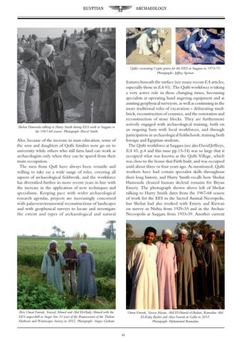 features beneath the surface (see many recent EA articles, especially those in EA 41). The Qufti workforce is taking a very active role in these changing times, becoming specialists at operating hand augering equipment and at assisting geophysical surveyors, as well as continuing in the more traditional roles of excavation - delineating mudbrick, reconstruction of ceramics, and the restoration and reconstruction of stone blocks. They are furthermore actively engaged with archaeological training, both on an ongoing basis with local workforces, and through participation in archaeological fieldschools, training both foreign and Egyptian students. The Qufti workforce at Saqqara (see also David Jeffreys, EA 43, p.4 and this issue pp.13-14) was so large that it occupied what was known as the Qufti Village, which was close to the house that Firth built, and was occupied until about three or four years ago. As mentioned, Qufti workers have had certain specialist skills throughout their long history, and Harry Smith recalls how Shehat Hamouda cleaned human skeletal remains for Bryan Emery. The photograph shown above left of Shehat talking to Harry Smith dates from the 1967-68 season of work for the EES in the Sacred Animal Necropolis, but Shehat had also worked with Emery and Kirwan on survey in Nubia from 1929-33 and in the Archaic Necropolis at Saqqara from 1933-39. Another current