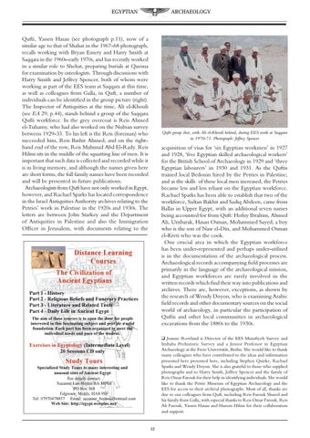 q Joanne Rowland is Director of the EES Minufiyeh Survey and Imbaba Prehistoric Survey and a Junior Professor in Egyptian Archaeology at the Freie Universität, Berlin. She would like to thank many colleagues who have contributed to the ideas and information presented here presented here, including Stephen Quirke, Rachael Sparks and Wendy Doyon. She is also grateful to those who supplied photographs and to Harry Smith, Jeffrey Spencer and the family of Reis Omar Farouk for their help in identifying individuals. She would like to thank the Petrie Museum of Egyptian Archaeology and the EES for access to their archival photographs. Most of all, thanks are due to our colleagues from Quft, including Reis Farouk Shared and his family from Galla, with especial thanks to Reis Omar Farouk, Reis Ali Farouk, Yassen Hasan and Hazem Hilmi for their collaboration and support.