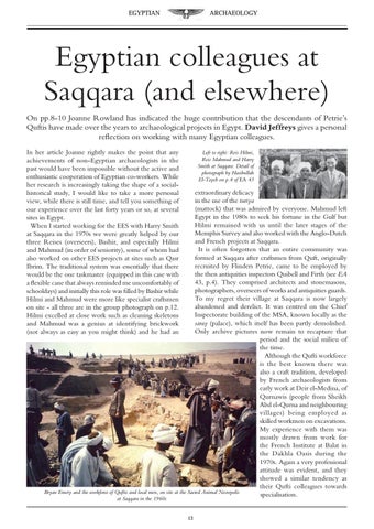 Egyptian colleagues at Saqqara (and elsewhere) On pp.8-10 Joanne Rowland has indicated the huge contribution that the descendants of Petrie’s Quftis have made over the years to archaeological projects in Egypt. David Jeffreys gives a personal reflection on working with many Egyptian colleagues. In her article Joanne rightly makes the point that any achievements of non-Egyptian archaeologists in the past would have been impossible without the active and enthusiastic cooperation of Egyptian co-workers. While her research is increasingly taking the shape of a socialhistorical study, I would like to take a more personal view, while there is still time, and tell you something of our experience over the last forty years or so, at several sites in Egypt. When I started working for the EES with Harry Smith at Saqqara in the 1970s we were greatly helped by our three Reises (overseers), Bashir, and especially Hilmi and Mahmud (in order of seniority), some of whom had also worked on other EES projects at sites such as Qasr Ibrim. The traditional system was essentially that there would be the one taskmaster (equipped in this case with a flexible cane that always reminded me uncomfortably of schooldays) and initially this role was filled by Bashir while Hilmi and Mahmud were more like specialist craftsmen on site - all three are in the group photograph on p.12. Hilmi excelled at close work such as cleaning skeletons and Mahmud was a genius at identifying brickwork (not always as easy as you might think) and he had an
