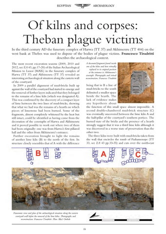 Of kilns and corpses: Theban plague victims In the third century AD the funerary complex of Harwa (TT 37) and Akhimenru (TT 404) on the west bank at Thebes was used to dispose of the bodies of plague victims. Francesco Tiradritti describes the archaeological context. A decorated fragment found inside one of the kilns and here virtually replaced in its original position at the entrance to Akhimenru’s cenotaph. Photographs and virtual reconstruction: Francesco Tiradritti