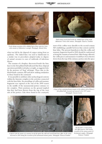 what was left by the disposal of corpses arising from an epidemic. The slaked lime was used as disinfectant in a similar way to procedures adopted today to dispose of animal carcasses in cases of outbreaks of infectious disease. The remains of a fireplace discovered beside the lime layer in the first pillared hall indicated that these disposal operations probably took place at night, as suggested also by the presence of ‘frog’ oil-lamps. These date to the third-fourth centuries AD and show striking similarities to those found in the courtyard. It was possible to attribute other archaeological contexts within the funerary complex to the activities connected with the lime kilns. An assemblage of coffin and mummy fragments was exposed at the end of the 2005 season in the middle of the monumental portico entrance to the complex. Their positions on the ground implied that they had been thrown from the top of the west side of the portico. Like those found in the courtyard,