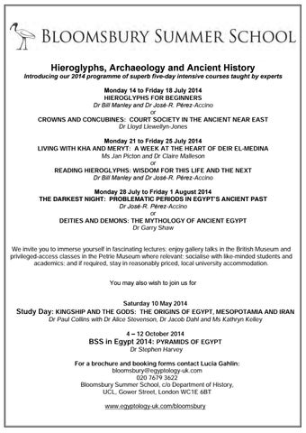 Introducing our 2014 programme of superb five-day intensive Monday to Dr Friday 18 July 2014 courses taught by experts Dr Bill Manley14 and José-R. Monday 14 to Friday 18 Pérez-Accino July 2014 Monday 14 to Friday 18 July 2014 HIEROGLYPHS FOR BEGINNERS or HIEROGLYPHS FOR18 BEGINNERS Monday 14 to Friday July 2014 Dr Bill ManleyCOURT and DrFOR José-R. Pérez-Accino HIEROGLYPHS BEGINNERS CROWNS AND CONCUBINES: SOCIETY IN THE ANCIENT NEAR EAST Dr Bill Manley and Dr José-R. Pérez-Accino HIEROGLYPHS FOR BEGINNERS Dr Bill Manley andLlewellyn-Jones DrorJosé-R. Pérez-Accino Dr Lloyd or Dr Bill Manley and Dror José-R. Pérez-Accino CROWNS AND CONCUBINES: COURT SOCIETY IN THE ANCIENT NEAR EAST CROWNS AND CONCUBINES: COURT SOCIETY IN THE ANCIENT NEAR EAST or Dr Lloyd Llewellyn-Jones CROWNS AND CONCUBINES: COURT SOCIETY IN 2014 THE ANCIENT NEAR EAST Monday to Friday 25 July Dr 21 Lloyd Llewellyn-Jones CROWNS AND CONCUBINES: COURT SOCIETY IN THE ANCIENT NEAR EAST Dr Lloyd Llewellyn-Jones LIVING WITH KHA AND MERYT: A WEEK AT THE HEART OF DEIR EL-MEDINA Dr Lloyd Llewellyn-Jones Monday 21 toand Friday 25 July 2014 Ms Jan Picton Dr Claire Malleson Monday 21 to Friday 25 July 2014 Friday 25THE JulyHEART 2014 OF DEIR EL-MEDINA LIVING WITH KHA ANDMonday MERYT:21AtoWEEK AT or LIVING WITH KHA AND MERYT: A WEEK AT THE HEART OF DEIR EL-MEDINA Monday 21AtoWEEK Friday 25THE July 2014 OF LIVING WITH KHA AND MERYT: AT HEART DEIR Ms Jan Picton and Dr Claire Malleson READING HIEROGLYPHS: WISDOM THIS LIFE AND THE EL-MEDINA NEXT Ms Jan Picton and DrFOR Claire Malleson LIVING WITH KHA AND MERYT: A WEEK AT THE HEART OF DEIR EL-MEDINA Ms Manley Jan Picton Dr ClairePérez-Accino Malleson Dr Bill andand Dror José-R. or Ms Jan Picton andorDr FOR ClaireTHIS Malleson READING HIEROGLYPHS: WISDOM LIFE AND THE NEXT READING HIEROGLYPHS: WISDOM FOR THIS LIFE AND THE NEXT or Dr Bill Manley andtoDrFriday José-R. Pérez-Accino READING HIEROGLYPHS: WISDOM FOR THIS LIFE AND THE NEXT Monday 28 July 1 August 2014 Dr Bill Manley and Dr José-R. Pérez-Accino READING HIEROGLYPHS: WISDOM FOR THIS LIFE AND THE NEXT Dr Bill Manley and Dr José-R. Pérez-Accino THE DARKEST NIGHT: PROBLEMATIC PERIODS IN EGYPT’S ANCIENT PAST Dr Bill Manley andtoDrFriday José-R. Pérez-Accino Monday 28 José-R. July 1 August 2014 MondayDr 28 July toPérez-Accino Friday 1 August 2014 Monday 28 July to Friday 1 August 2014 THE DARKEST NIGHT: PROBLEMATIC PERIODS IN EGYPT’S ANCIENT PAST or PERIODS IN EGYPT’S THE DARKEST NIGHT: PROBLEMATIC ANCIENT PAST Monday 28 July to Friday 1 August 2014 Dr José-R. Pérez-Accino THE DARKEST PROBLEMATIC PERIODS IN DEITIES NIGHT: AND DEMONS: THE MYTHOLOGY OFEGYPT’S ANCIENTANCIENT EGYPT PAST Dr José-R. Pérez-Accino THE DARKEST NIGHT: PROBLEMATIC PERIODS IN EGYPT’S ANCIENT PAST or Dr José-R. Pérez-Accino Dr Garry orShaw Dr José-R. Pérez-Accino or DEITIES AND DEMONS: THE MYTHOLOGY OF ANCIENT EGYPT DEITIES AND DEMONS: THE MYTHOLOGY OF ANCIENT EGYPT or Shaw Dr Garry DEITIES AND DEMONS: THE MYTHOLOGY OF ANCIENT We invite you to immerse yourself in fascinating lectures; enjoy gallery talks in EGYPT the British Museum and Dr Garry Shaw DEITIES AND DEMONS: THE MYTHOLOGY OF ANCIENT EGYPT Dr Garry Shaw privileged-access classes in the Petrie Museum where relevant; socialise with like-minded students and Dr Garry Shaw We invite you to immerse instay fascinating lectures; enjoylocal gallery talks inaccommodation. the British Museum and academics; and if yourself required, in reasonably priced, university We invite you to immerse yourself in fascinating lectures; enjoy gallery talks in the British Museum and privileged-access classes in the Petrie Museum where relevant; socialise withinlike-minded studentsand and We invite you to immerse yourself in fascinating lectures; enjoy gallery talks the British Museum privileged-access classes yourself in the Petrie Museum lectures; where relevant; socialise with like-minded studentsand and We invite you to immerse instay fascinating enjoylocal gallery talks inaccommodation. the British Museum academics; and ifin required, in reasonably priced, university privileged-access classes the Petrie Museum where relevant; socialise with like-minded students and You may also wish to join us for academics; and if required, stay in reasonably priced, local university accommodation. privileged-access classes the Petrie Museum where relevant; socialise with accommodation. like-minded students and academics; and ifin required, stay in reasonably priced, local university Saturday 1 March 2014 academics; and if required, stay in reasonably priced, local university accommodation. You may also wish to join us for Study Day: A NEW CHRONOLOGY FOR EARLY EGYPT You may also wish to join us for March 2014 YouSaturday may also 1wish to join us for Saturday 1 March 2014 Dr Alice Stevenson and Dr Michael Dee You mayCHRONOLOGY also 1wish to join us for Saturday March 2014 Study Day: A NEW FOR EARLY EGYPT Saturday 10March May 2014 Study Day: A NEW CHRONOLOGY FOR EARLY EGYPT Saturday 1 2014 Study Day: A NEW CHRONOLOGY FOR EARLY Dr Alice Stevenson and Dr Michael Dee EGYPT Study Day: KINGSHIP AND THE GODS: THE ORIGINS OF EGYPT, Dr Alice Stevenson and Dr Michael Dee MESOPOTAMIA AND IRAN Study Day: A NEW CHRONOLOGY FOR EARLY May Dr Alice Saturday Stevenson10 and Dr2014 Michael Dee EGYPT Saturday 10 May 2014 Dr Paul Collins withDr DrAlice AliceStevenson Stevenson, Dr Jacob Dahl and Kathryn Kelley and Dr2014 Michael Dee Ms Saturday May Study Day: KINGSHIP AND THE GODS: THE10 ORIGINS OF EGYPT, MESOPOTAMIA AND IRAN Study Day: KINGSHIP AND THE GODS: THE10ORIGINS OF EGYPT, MESOPOTAMIA AND IRAN Saturday May 2014 Study Day: GODS: THE ORIGINS OF EGYPT, MESOPOTAMIA Dr KINGSHIP Paul CollinsAND withTHE Dr Alice Stevenson, Dr Jacob Dahl and Ms Kathryn Kelley AND IRAN 4 – 12 October 2014 DrKINGSHIP Paul Collins withTHE Dr Alice Stevenson, Dr Jacob Dahl and Ms Kathryn Kelley Study Day: AND GODS: THE ORIGINS OF EGYPT, MESOPOTAM