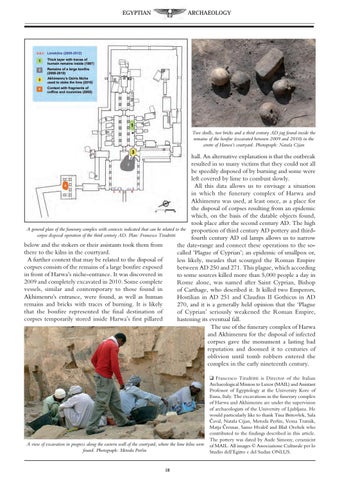 hall. An alternative explanation is that the outbreak resulted in so many victims that they could not all be speedily disposed of by burning and some were left covered by lime to combust slowly. All this data allows us to envisage a situation in which the funerary complex of Harwa and Akhimenru was used, at least once, as a place for the disposal of corpses resulting from an epidemic which, on the basis of the datable objects found, took place after the second century AD. The high A general plan of the funerary complex with contexts indicated that can be related to the proportion of third century AD pottery and thirdcorpse disposal operation of the third century AD. Plan: Francesco Tiradritti fourth century AD oil lamps allows us to narrow below and the stokers or their assistants took them from the date-range and connect these operations to the sothere to the kilns in the courtyard. called ‘Plague of Cyprian’; an epidemic of smallpox or, A further context that may be related to the disposal of less likely, measles that scourged the Roman Empire corpses consists of the remains of a large bonfire exposed between AD 250 and 271. This plague, which according in front of Harwa’s niche-entrance. It was discovered in to some sources killed more than 5,000 people a day in 2009 and completely excavated in 2010. Some complete Rome alone, was named after Saint Cyprian, Bishop vessels, similar and contemporary to those found in of Carthage, who described it. It killed two Emperors, Akhimenru’s entrance, were found, as well as human Hostilian in AD 251 and Claudius II Gothicus in AD remains and bricks with traces of burning. It is likely 270, and it is a generally held opinion that the ‘Plague that the bonfire represented the final destination of of Cyprian’ seriously weakened the Roman Empire, corpses temporarily stored inside Harwa’s first pillared hastening its eventual fall. The use of the funerary complex of Harwa and Akhimenru for the disposal of infected corpses gave the monument a lasting bad reputation and doomed it to centuries of oblivion until tomb robbers entered the complex in the early nineteenth century.