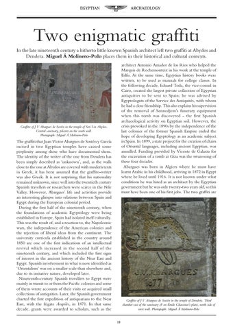 Two enigmatic graffiti In the late nineteenth century a hitherto little known Spanish architect left two graffiti at Abydos and Dendera. Miguel Á Molinero-Polo places them in their historical and cultural contexts. architect Antonio Amador de los Rios who helped the Marquis de Rochemonteix in his work at the temple of Edfu. At the same time, Egyptian history books were written, to be used as manuals for college classes. In the following decade, Eduard Toda, the vice-consul in Cairo, created the largest private collection of Egyptian antiquities to be sent to Spain; he was advised by Egyptologists of the Service des Antiquités, with whom he had a close friendship. This also explains his supervision of the removal of Sennedjem’s funerary equipment when this tomb was discovered - the first Spanish archaeological activity on Egyptian soil. However, the crisis provoked in the 1890s by the independence of the last colonies of the former Spanish Empire ended the hope of developing Egyptology as an academic subject in Spain. In 1899, a state project for the creation of chairs of Oriental languages, including ancient Egyptian, was annulled. Funding provided by Vicente de Galarza for the excavation of a tomb at Giza was the swan-song of these four decades. Abargues was born in Algiers where he must have learnt Arabic in his childhood, arriving in 1872 in Egypt where he lived until 1916. It is not known under what conditions he was hired as an architect by the Egyptian government but he was only twenty-two years old, so this must have been one of his first jobs. The two graffiti are