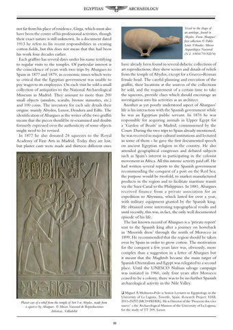 have already been found in several didactic collections of art reproductions; they show scenes and details of reliefs from the temple of Abydos, except for a Graeco-Roman female head. The careful planning and execution of the graffiti, their locations at the sources of the collections he sold, and the requirement of a certain time to take the squeezes, provide clues which should encourage an investigation into his activities as an architect. Another as yet poorly understood aspect of Abargues’ life is his interaction with the Spanish government while he was an Egyptian public servant. In 1876 he was responsible for acquiring animals in Upper Egypt for a ‘Garden of Beasts’ in Madrid, commissioned by the Court. During the two trips to Spain already mentioned, he was received in major cultural institutions and lectured in some of them - he gave the first documented speech on ancient Egyptian religion in the country. He also attended geographical congresses and debated subjects such as Spain’s interest in participating in the colonist movement in Africa. All this intense activity paid off. He had written several reports to the Spanish government recommending the conquest of a port on the Red Sea; the purpose would be twofold, to market manufactured products in the region and to facilitate maritime transit via the Suez Canal to the Philippines. In 1881, Abargues received finance from a private association for an expedition to Abyssinia, which lasted for over a year, with military equipment granted by the Spanish king. He obtained some interesting topographical results and until recently, this was, in fact, the only well documented episode of his life. The last known record of Abargues is a ‘private report’ sent to the Spanish king after a journey on horseback in ‘Moorish dress’ through the north of Morocco in 1899. He recommended that the region should be taken over by Spain in order to grow cotton. The motivation for the conquest a few years later was, obviously, more complex than a suggestion in a letter of Abargues but it meant that the Maghreb became the main target of Spanish Orientalism and Egypt was relegated to a second place. Until the UNESCO Nubian salvage campaign was initiated in 1960, only four years after Morocco ceased to be a colony, there was to be no further Spanish archaeological activity in the Nile Valley. q Miguel Á Molinero-Polo is Senior Lecturer in Egyptology in the University of La Laguna, Tenerife, Spain. Research Project: HAR 2011-25292 (MCI+FEDER). He is Director of the ‘Proyecto dos cero nueve’ - the Archaeological Mission of the University of La Laguna, for the study of TT 209, Luxor.
