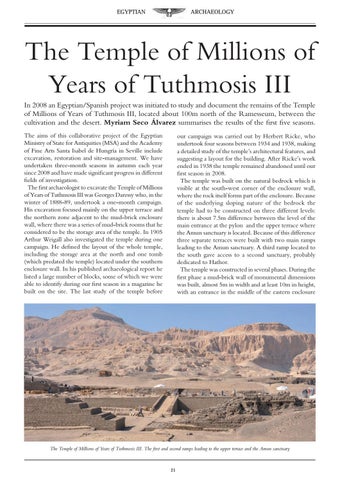 The Temple of Millions of Years of Tuthmosis III In 2008 an Egyptian/Spanish project was initiated to study and document the remains of the Temple of Millions of Years of Tuthmosis III, located about 100m north of the Ramesseum, between the cultivation and the desert. Myriam Seco Álvarez summarises the results of the first five seasons. The aims of this collaborative project of the Egyptian Ministry of State for Antiquities (MSA) and the Academy of Fine Arts Santa Isabel de Hungría in Seville include excavation, restoration and site-management. We have undertaken three-month seasons in autumn each year since 2008 and have made significant progress in different fields of investigation. The first archaeologist to excavate the Temple of Millions of Years of Tuthmosis III was Georges Daressy who, in the winter of 1888-89, undertook a one-month campaign. His excavation focused mainly on the upper terrace and the northern zone adjacent to the mud-brick enclosure wall, where there was a series of mud-brick rooms that he considered to be the storage area of the temple. In 1905 Arthur Weigall also investigated the temple during one campaign. He defined the layout of the whole temple, including the storage area at the north and one tomb (which predated the temple) located under the southern enclosure wall. In his published archaeological report he listed a large number of blocks, some of which we were able to identify during our first season in a magazine he built on the site. The last study of the temple before