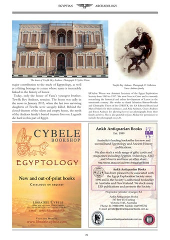 Ankh Antiquarian Books has been pleased to be associated with the Egypt Exploration Society since 1990 and is the Society’s authorised bookseller in Australia and NewZealand. We stock many EES publications and promote the Society. Proprietor: Jennifer A Jaeger, BA Ankh Antiquarian Books PO Box 133 Darling Victoria 3145, Australia Phone: 61 398881990. Mobile: 0419395782 E-mail: jennifer@ankhantiquarianbooks.com.au