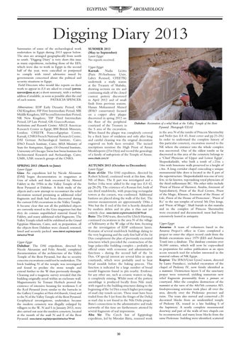 Digging Diary 2013 Summaries of some of the archaeological work undertaken in Egypt during 2013 appear below. The sites are arranged geographically from north to south. ‘Digging Diary’ is very short this issue as many expeditions, including those of the EES, which were due to work in Egypt in the second half of the year, were cancelled or postponed to comply with travel advisories issued by governments concerned about the political and security situations in Egypt. Field Directors who would like reports on their work to appear in EA are asked to e-mail (patricia. spencer@ees.ac.uk ) a short summary, with a website address if available, as soon as possible after the end of each season. PATRICIA SPENCER Abbreviations: EDP Early Dynastic Period; OK Old Kingdom; FIP First Intermediate Period; MK Middle Kingdom; SIP Second Intermediate Period; NK New Kingdom; TIP Third Intermediate Period; LP Late Period; GR Graeco-Roman. Institutions and Research Centres: ARCE American Research Center in Egypt; BM British Museum, London; CFEETK Franco-Egyptian Centre, Karnak; CNRS French National Research Centre; DAI German Archaeological Institute, Cairo; IFAO French Institute, Cairo; MSA Ministry of State for Antiquities, Egypt; OI Oriental Institute, University of Chicago; Swiss Inst Swiss Institute for Architectural Research and Archaeology, Cairo; UMR, USR research groups of the CNRS. SPRING 2013 (March to June) Lower Egypt Giza: An expedition led by Nicole Alexanian (DAI) began documentation in magazines at Giza of reliefs and finds excavated by Ahmed Fakhry in the 1950s in the Valley Temple of the Bent Pyramid at Dahshur. A fresh study of the objects and a new attempt to reconstruct the relief decoration seemed promising as additional relief fragments and finds had been discovered during the current DAI excavations in the Valley Temple. It became clear that not all the published objects are currently stored in the Giza magazines but that they do contain unpublished material found by Fakhry, and many additional relief fragments. The Valley Temple reliefs will be exhibited in the Grand Egyptian Museum, Cairo, and, in preparation, all the objects from Dahshur were cleaned, restored, listed and securely packed. www.dainst.org/de/project/ dahschur?ft=all