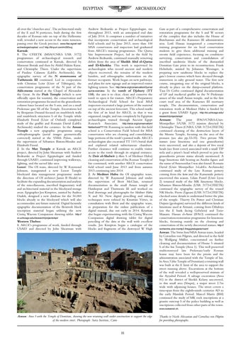 all over the ‘churches area’. The architectural study of the E and N porticoes, built during the first decades of Roman rule on top of the Hellenistic wall, revealed a new access to the main temenos, passing over the Greek precinct. www.ifao.egnet.net/ archeologie/coptos/ and http://tinyurl.com/m265xuj. Karnak: 1. The CFEETK (MSA/CNRS USR 3172) programmes of archaeological research and conservation continued at Karnak, directed by Mansour Boraik and then by Abdel Hakim Karar, and Christophe Thiers. Under the supervision of Pauline Calassou (LabEx Archimede), the epigraphic survey of the N storerooms of Tuthmosis III continued. Led in cooperation with Christian Leitz (Univ of Tübingen), the conservation programme of the N part of the Akh-menu started at the Chapel of Alexander the Great. At the Ptah Temple (which is now officially open for tourists), the conservation and restoration programme focused on the granodiorite column bases located on the S axis, and on a small Ptolemaic gate SE of the Temple. Excavations led by Benjamin Durand focused on mud-brick walls and mud-brick structures S of the Temple while Elizabeth Frood (Univ of Oxford) completed study of the graffiti and Romain David (LabEx Archimede) studied the ceramics. In the Amun Temple a new epigraphic programme using orthophotographs (aerial images geometrically corrected) started at the VIIIth Pylon, under the supervision of Sébastien Biston-Moulin and Elizabeth Frood. 2. In the Mut Temple at Karnak an ARCE project, directed by John Shearman with Andrew Bednarski as Project Egyptologist and funded through USAID, continued improving walkways, lighting, and the sacred lake area. Luxor: The OI team, directed by W Raymond Johnson, inaugurated a new Luxor Temple blockyard data management programme under the direction of OI architect James B Heidel to facilitate the expanding documentation and analysis of the miscellaneous, inscribed fragmentary wall and architectural material in the blockyard storage areas. Epigrapher Jen Kimpton, assisted by Andrea Dudek, designed a new database for the 50,000 blocks already in the blockyard which will also accommodate any future material. Digital facsimile epigraphic documentation of the Bentresh block inscription material began utilising the new Cintiq Wacom Companion drawing tablet. http:// oi.uchicago.edu/research/projects/epi/