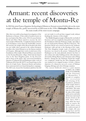 Armant: recent discoveries at the temple of Montu-Re In 2002 the joint Franco-Egyptian Archaeological Mission at Armant resumed fieldwork on the main temple of Montu-Re, partly uncovered by an EES team in the 1930s. Christophe Thiers describes the main results of the most recent campaign. After their successful archaeological investigation of the Bucheum at Armant, 15 km south of modern Luxor on the west bank of the Nile, in the 1935-36 season Robert Mond and Oliver Myers started to excavate the site’s main temple of Montu-Re. Completely destroyed down to its foundation courses from the fourth-fifth centuries AD onward, the temple of the falcon-headed solar deity was not visible above ground to the earliest European travellers who visited Armant to see the famous mammisi of Cleopatra. Although their work revealed most of the foundations of the temple, Mond and Myers concentrated on the Roman-Byzantine village which had developed close to the New Kingdom pylon. In the forecourt and in front of the pylon, they uncovered foundation deposits of Tuthmosis III and Hatshepsut while a stela of Tuthmosis III (Cairo JE 66377) was found lying on the floor of a Coptic house. Numerous blocks and artefacts from various periods were found during these campaigns. The EES team cleaned the foundation platform but did
