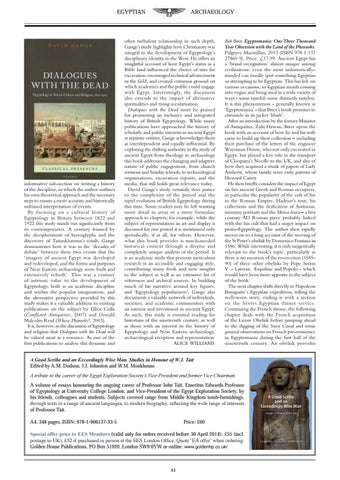 often turbulent relationship in such depth, Gange’s study highlights how Christianity was integral to the development of Egyptology’s disciplinary identity in the West. He offers an insightful account of how Egypt’s status as a Bible land influenced the choice of sites for excavation, encouraged technical advancement in the field, and created common ground on which academics and the public could engage with Egypt. Interestingly, the discussion also extends to the impact of alternative spiritualities and rising secularisation. Dialogues with the Dead must be praised for promoting an inclusive and integrated history of British Egyptology. While many publications have approached the history of scholarly and public interests in ancient Egypt as separate entities, Gange acknowledges them as interdependent and equally influential. By exploring the shifting authority in the study of ancient Egypt from theology to archaeology this book addresses the changing and adaptive nature of public engagement, from church sermons and Sunday schools, to archaeological organisations, excavation reports, and the media, that still holds great relevance today. David Gange’s study certainly does justice to the complexity of the period and the rapid evolution of British Egyptology during this time. Some readers may be left wanting more detail in areas or a more formulaic approach to chapters; for example, while the subject of representation in art and display is discussed for one period it is mentioned only sporadically, if at all, for others. However, what this book provides is much-needed historical context through a diverse and completely unique analysis of the period. It is an academic study that presents meticulous research in an accessible and engaging style, contributing many fresh and new insights to the subject as well as an extensive list of references and archival sources. In building much of his narrative around key figures, and ‘Egyptology popularizers’, Gange also documents a valuable network of individuals, societies, and academic communities with an interest and investment in ancient Egypt. As such, this study is essential reading for historians of the nineteenth century, as well as those with an interest in the history of Egyptology and Near Eastern archaeology, archaeological reception and representation. ALICE WILLIAMS