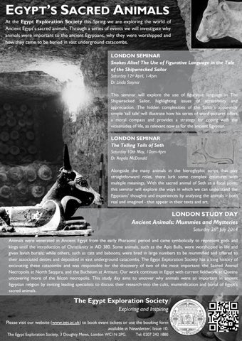 At the Egypt Exploration Society this Spring we are exploring the world of Ancient Egypt’s sacred animals. Through a series of events we will investigate why animals were important to the ancient Egyptians, why they were worshipped and how they came to be buried in vast underground catacombs. LONDON SEMINAR Snakes Alive! The Use of Figurative Language in the Tale of the Shipwrecked Sailor Saturday 12th April, 1-4pm Dr Linda Steynor This seminar will explore the use of figurative language in The Shipwrecked Sailor, highlighting issues of accessibility and appreciation. The hidden complexities of the Sailor’s apparently simple ‘tall tale’ will illustrate how his series of word-pictures offers a moral compass and provides a strategy for coping with the vicissitudes of life, as relevant now as for the ancient Egyptian.