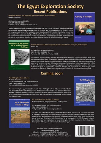 EES publications can be purchased from: The Egypt Exploration Society 3 Doughty Mews, London WC1N 2PG, United Kingdom. Telephone: +44 (0)20 7242 2266. Fax: +44 (0)20 7404 6118. E-mail: maria.idowu@ees.ac.uk. On-line shop: www.ees-shop.com