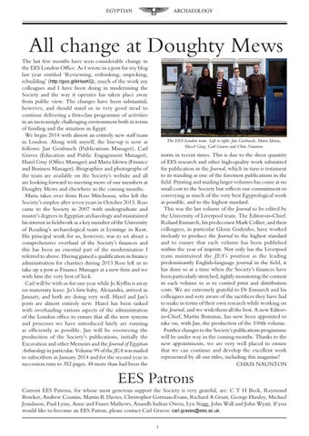 norm in recent times. This is due to the sheer quantity of EES research and other high-quality work submitted for publication in the Journal, which in turn is testament to its standing as one of the foremost publications in the field. Printing and mailing larger volumes has come at no small cost to the Society but reflects our commitment to conveying as much of the very best Egyptological work as possible, and to the highest standard. This was the last volume of the Journal to be edited by the University of Liverpool team. The Editor-in-Chief, Roland Enmarch, his predecessor Mark Collier, and their colleagues, in particular Glenn Godenho, have worked tirelessly to produce the Journal to the highest standard and to ensure that each volume has been published within the year of imprint. Not only has the Liverpool team maintained the JEA’s position as the leading predominantly English-language journal in the field, it has done so at a time when the Society’s finances have been particularly stretched, tightly monitoring the content in each volume so as to control print and distribution costs. We are extremely grateful to Dr Enmarch and his colleagues and very aware of the sacrifices they have had to make in terms of their own research while working on the Journal, and we wish them all the best. A new Editorin-Chief, Martin Bommas, has now been appointed to take on, with Jan, the production of the 100th volume. Further changes to the Society’s publications programme will be under way in the coming months. Thanks to the new appointments, we are very well placed to ensure that we can continue and develop the excellent work represented by all our titles, including this magazine! CHRIS NAUNTON