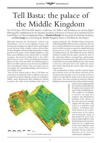 Tell Basta: the palace of the Middle Kingdom On 12-14 June 2013 the EES hosted a conference on ‘Palaces and Residences in ancient Egypt’ following the establishment by the Austrian Academy of Sciences in Vienna of an Austrian Science Fund Project on ‘Ancient Egyptian Palaces’. Manfred Bietak, his team from the Austrian Academy, and Eva Lange are researching the Middle Kingdom Palace at Tell Basta for the Project. Although forming the ideological, cultural and administrative core of ancient Egyptian society, well documented royal palaces are still rare in the archaeological record and most of the available evidence derives from the New Kingdom. We know little about palaces of older periods but the palace of the Middle Kingdom at Tell Basta, ancient Bubastis in the eastern Delta, is a notable exception. Excavated by Shafiq Farid in the 1960s, Ahmed Essawi in the 1970s and Mohammed Ibrahim Bakr in the late 1970s and 1980s, the Tell Basta palace is still not yet fully explored and so far has been published only in preliminary reports. Our new project aims to reinvestigate this outstanding building and its historical and cultural context. Like all Near Eastern palaces, that at Tell Basta was constructed of mud-brick which is difficult to preserve if unprotected and the Ministry of State for Antiquities (MSA), under Mohammed Abd el-Maksoud, decided to protect the walls of the building under layers of