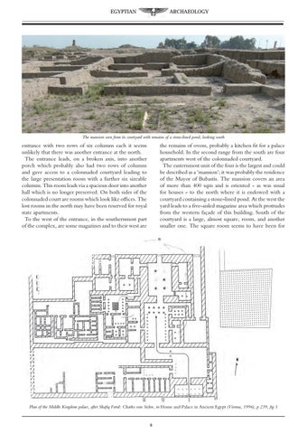 entrance with two rows of six columns each it seems unlikely that there was another entrance at the north. The entrance leads, on a broken axis, into another porch which probably also had two rows of columns and gave access to a colonnaded courtyard leading to the large presentation room with a further six sizeable columns. This room leads via a spacious door into another hall which is no longer preserved. On both sides of the colonnaded court are rooms which look like offices. The lost rooms in the north may have been reserved for royal state apartments. To the west of the entrance, in the southernmost part of the complex, are some magazines and to their west are