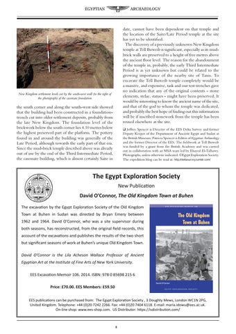 The Egypt Exploration Society New Publication David O’Connor, The Old Kingdom Town at Buhen The excavation by the Egypt Exploration Society of the Old Kingdom E E S