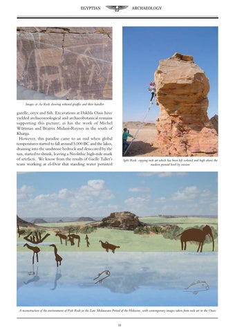 gazelle, oryx and fish. Excavations at Dakhla Oasis have yielded archaeozoological and archaeobotanical remains supporting this picture, as has the work of Michel Wüttman and Béatrix Midant-Reynes in the south of Kharga. However, this paradise came to an end when global temperatures started to fall around 5,000 BC and the lakes, draining into the sandstone bedrock and desiccated by the sun, started to shrink, leaving a Neolithic high-tide mark of artefacts. We know from the results of Gaelle Tallet’s team working at el-Deir that standing water persisted