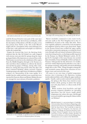 Wetter interludes continued to raise water levels, and rainy spells in the New Kingdom led to the reestablishment of pools in the earlier lake beds. These were regularly exploited, as attested by rock inscriptions and amphorae found in what is now deep desert. Again in the Roman Period rains re-filled the upper aquifer and modest communities sprang up, accessing this stored water through wells and manawir and qanats (subterranean water-harvesting tunnels, a technology possibly imported by the Persians, see Michel Wüttman’s article, EA 22, pp.36-37). Examples of the many Roman sites include Qasr el-Lebekha, Umm el-Dabadib, el-Deir and Qasr elSumayra. Subsequently the lake dried into ever smaller, and more widely dispersed pools until there were only a few springs remaining, with gazelle and ostrich still taking refuge there in the 1950s. Pumps brought in during the early twentieth century allowed the extraction of everdeeper water and renewal of the oasis. Of course in our own times of global temperature increase, rain is returning to the depression, creating modest ephemeral lakes and re-filling the upper sandstone aquifer. Gazelle, until recently restricted to pockets like the spring at Ain Amur, have started to roam further afield, grazing on plants that spring up in the playa basins as a direct result of this rainfall. While modern deep boreholes and high pressure irrigation sprinklers are spreading agriculture into the desert, might global temperature rise achieve the same end through increased rainfall re-greening the Sahara within our lifetimes?