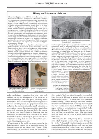and test and salvage excavations. Our longer term goals included tracing the development of the town and its hinterland through time and space; advancing Third Intermediate Period archaeology by excavating stratified deposits; correlating textual and epigraphic materials from and about the site to its archaeology; and, ultimately, in cooperation with the Egyptian authorities, establishing an open-air museum at the site to aid the local economy. To date we have identified various functional areas and established that the town was founded in the Third Intermediate Period, reaching its greatest extent and importance during that era, after which there was a marked shrinkage in urban size. With the rest of the world, our team watched as the Egyptian people carried out a revolution against the Mubarak regime in late January and February 2011. Unfortunately the tumultuous times also resulted in a 14