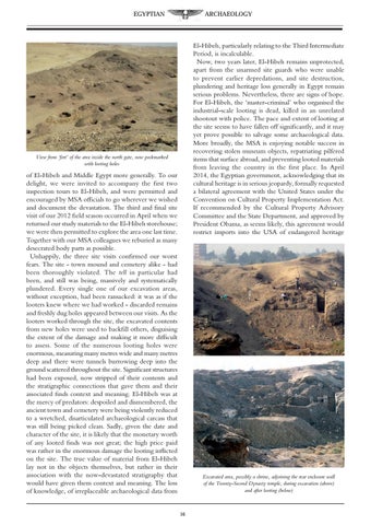 El-Hibeh, particularly relating to the Third Intermediate Period, is incalculable. Now, two years later, El-Hibeh remains unprotected, apart from the unarmed site guards who were unable to prevent earlier depredations, and site destruction, plundering and heritage loss generally in Egypt remain serious problems. Nevertheless, there are signs of hope. For El-Hibeh, the ‘master-criminal’ who organised the industrial-scale looting is dead, killed in an unrelated shootout with police. The pace and extent of looting at the site seems to have fallen off significantly, and it may yet prove possible to salvage some archaeological data. More broadly, the MSA is enjoying notable success in recovering stolen museum objects, repatriating pilfered items that surface abroad, and preventing looted materials from leaving the country in the first place. In April 2014, the Egyptian government, acknowledging that its cultural heritage is in serious jeopardy, formally requested a bilateral agreement with the United States under the Convention on Cultural Property Implementation Act. If recommended by the Cultural Property Advisory Committee and the State Department, and approved by President Obama, as seems likely, this agreement would restrict imports into the USA of endangered heritage