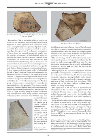 his siblings, women and offspring. None of the individuals buried here seems to be known from other sources and it is possible that they were not among the most prestigious members of the royal family, but rather belonged more generally to the women’s quarters of the court. The handwriting, which is different for every name attested, and variations in the jar shapes indicate that the tomb was used over an appreciable time span. Two jar inscriptions mentioning a date in year 25 might indicate that funerary activity took place here for much of the reign of Amenhotep III. Anthropological and medico-radiographical research planned for coming seasons should tell us more about the individuals buried in KV 40. Several elaborately mummified infants are among the badly looted human remains and their sophisticated treatment is perhaps indicative of their royal status. It is hoped that DNA analyses will, in the future, help to establish genetic profiles and family relationships. The significance of KV 40 lies in its preservation of what appears to be a coherent social group within the royal court. Women - some of royal descent and others perhaps from abroad - seem to have lived and brought up their children together and were buried together in one tomb. So far, only a few individuals have been identified among the owners of minor burials in the Valley of the Kings. The recent find in KV 40 now adds over thirty people from the king’s immediate personal entourage. The Valley was clearly conceived as a family necropolis, and tombs like KV 40 might even have inspired Ramesses II when he created KV 5 as a monumental burial place for his numerous offspring. q Susanne Bickel is Director of the University of Basel Kings’ Valley Project and Elina Paulin-Grothe directs the work in the field. They acknowledge gratefully the help of the members of the MSA in Egypt and the generous support of sponsors of the project. Photographs © University of Basel Kings’ Valley Project. Annual reports: http://