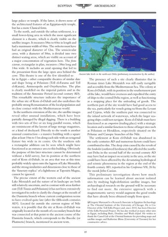 large palace or temple. If the latter, it shows none of the architectural features of an Egyptian-style temple, but has a more Classical form. To the north, and outside the urban settlement, is a small lower-lying area in which the most significant element is a theatre, which is clearly visible on the satellite images. It measures 58m to 60m in length and had a maximum width of 44m. The orchestra must have had an original diameter of 12m. The semicircular cavea, with a diameter of 58m, is divided into two distinct seating areas, which are visible on account of a major concentration of vegetation here. The frons scaenae, rectangular in plan, measures c.58m long and 14m wide. It includes an axial opening that led to the proscaenium from the large open area behind the Ancient lake levels in the north-east Delta (preliminary reconstruction by the author) scene. This theatre is one of the few identified so far in Egypt - other comparable theatres of similar date The presence of such a site clearly illustrates that in and shape being at Pelusium (Tell el-Farama and Tell Roman times Lake Menzaleh was still easily navigable el-Kanais), Antinoopolis and Oxyrhynchus. The plan and accessible from the Mediterranean Sea. The colony at is clearly modelled on the imperial pattern and in the Kom el-Dahab, with its position in the southernmost part tradition of the Antonine Period (second century AD). of the lake, would have overseen and expedited the entry This remarkable structure indicates the importance of of ships to the central Delta region, as well as functioning the urban site of Kom el-Dahab and also underlines the as a stopping place for the unloading of goods. The probable strong Romanisation of the local population and northern part of the site would have had good access to its close contact with the Mediterranean world. the sea, particularly for vessels going to/from the Levant In the northern extension of the site, the satellite images and Cyprus, while the southern part was connected to reveal other unusual installations, which have been the inland network of waterways, which the larger seapartially damaged by illegal digging. There is a building going ships could not navigate. Kom el-Dahab must have with two sets of five or six long parallel rooms, which functioned as an emporion (trading place) with a strategic are reminiscent of the layout of large storage magazines, location and a similar function to those of larger sites such or a kind of dockyard. Directly to the south is another as Pelusium or Heraklion, respectively situated on the unusual construction - a massive building with a square Pelusiac and Canopic branches of the Nile. plan at least 10m to 11m along each side with an octagonal The settlement at Kom el-Dahab was abandoned in feature 6m wide in its centre. On the southern side the early centuries AD and numerous factors could have a rectangular addition can be seen which might have contributed to this. The deep crisis caused by the revolt of functioned as an entrance area to this building. Obviously the boukoloi (outlawed herdsmen) that affected the norththe purpose of this later structure cannot be determined east Delta in the second half of the second century AD without a field survey, but its position at the northern may have had an impact on security in the area, or the site end of Kom el-Dahab, in an area that was at this time could have been affected by the devastating hydrological probably widely open onto the lagoon of Lake Menzaleh, and seismic phenomena in the region at the end of the and the strong similarities and dimensions close to those of fourth century AD, reported in his Conference VII, 26 by the ‘funerary replica’ of a lighthouse at Taposiris Magna, the monk John Cassian. cannot be ignored. This preliminary investigation shows how much The precise extent of the western end of the ancient information can be learned about ancient isolated Lake Menzaleh and the nature of its landscape are both sites by studying high-definition satellite images, but still relatively uncertain, and in contrast with areas further archaeological research on the ground will be necessary east (Tell Tinnis and Pelusium) it has not been extensively to find out more. An extensive approach with a investigated in order to clarify the changes at the mouth of magnetometric survey would augment the good results the Damietta branch whose current configuration seems that have already been obtained simply from space. to have evolved quite late (after the fifth-sixth centuries q Gregory Marouard is a Research Associate in Egyptian Archaeology AD?). Located far outside the current regime of Nile at The Oriental Institute of the University of Chicago. He is Cowaters, it is possible that the site at Kom el-Dahab was Director of the Tell Edfu Project and, since 2010, has been Director of the Edfu Pyramid Project. He has also worked at many other sites originally located at the mouth of a secondary branch that in Egypt, including Buto, Dendara and Wadi el-Jarf. He wishes to was connected at that point to the ancient course of the thank the Camel Lab at the Oriental Institute for providing maps and Damietta branch, which corresponds to the Bucolic (or satellite images and Katherine Bloin (University of Toronto) for her Phatmetic) branch, mentioned in ancient texts. constructive advice. 27