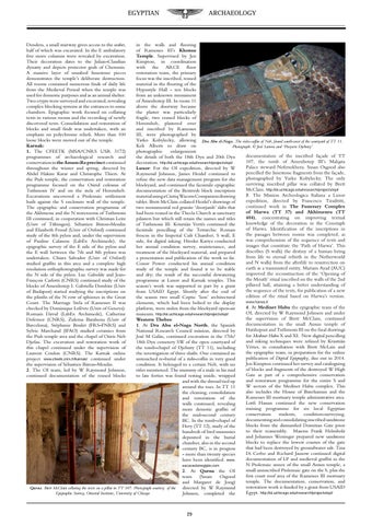 Dendera, a small stairway gives access to the wabet, half of which was excavated. In the E ambulatory five more columns were revealed by excavation. Their decoration dates to the Julian-Claudian dynasty and depicts protector gods of Chemmis. A massive layer of smashed limestone pieces demonstrates the temple’s deliberate destruction. All rooms contained numerous finds of daily life from the Medieval Period when the temple was used for domestic purposes and as an animal shelter. Two crypts were surveyed and excavated, revealing complex blocking systems at the entrances to some chambers. Epigraphic work focused on collating texts in various rooms and the recording of newly discovered texts. Consolidation and restoration of blocks and small finds was undertaken, with an emphasis on polychrome reliefs. More than 100 loose blocks were moved out of the temple. Karnak: 1. The CFEETK (MSA/CNRS USR 3172) programmes of archaeological research and conservation in the Amun-Re precinct continued throughout the winter and spring, directed by Abdel Hakim Karar and Christophe Thiers. At the Ptah temple, the conservation and restoration programme focused on the Osirid colossus of Tuthmosis IV and on the stela of Horemheb. Excavations uncovered a Ptolemaic settlement built against the S enclosure wall of the temple. The epigraphic and conservation programme of the Akhmenu and the N storerooms of Tuthmosis III continued, in cooperation with Christian Leitz (Univ of Tübingen). Sébastien Biston-Moulin and Elizabeth Frood (Univ of Oxford) continued study of the 8th pylon and, under the supervision of Pauline Calassou (LabEx Archimede), the epigraphic survey of the E side of the pylon and the E wall between the 7th and 8th pylons was undertaken. Chiara Salvador (Univ of Oxford) studied graffiti in this area and a complete high resolution orthophotographic survey was made for the N side of the pylon. Luc Gabolde and JeanFrançois Carlotti (CNRS) continued study of the blocks of Amenhotep I. Gabriella Dembitz (Univ of Budapest) started studying the inscriptions on the plinths of the N row of sphinxes in the Great Court. The Marriage Stela of Ramesses II was checked by Dominique Lefèvre (Univ of Geneva). Romain David (LabEx Archimede), Catherine Defernez (CNRS), Zulema Barahona (Univ of Barcelona), Stéphanie Boulet (FRS-FNRS) and Sylvie Marchand (IFAO) studied ceramics from the Ptah temple area and the chapel of Osiris Neb Djefau. The excavation and restoration work of this chapel continued under the supervision of Laurent Coulon (CNRS). The Karnak online project www.cfeetk.cnrs.fr/karnak/ continued under the supervision of Sébastien Biston-Moulin. 2. The OI team, led by W Raymond Johnson, continued documentation of the reused blocks