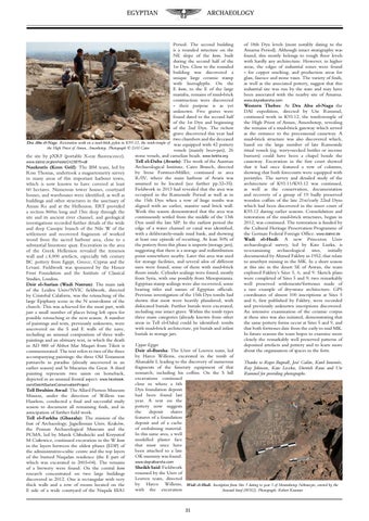 Period. The second building of 18th Dyn levels (most notably dating to the is a rounded structure on the Amarna Period). Although intact stratigraphy was NE slope of the kom, built found, this mostly belongs to rough floor levels during the second half of the with hardly any architecture. However, in higher 1st Dyn. Close to the rounded areas, the edges of industrial zones were found building was discovered a - for copper smelting, and production areas for unique large ceramic stamp glass, faience and stone vases. The variety of finds, with hieroglyphs. On the as well as the associated pottery, suggest that this E kom, to the E of the large industrial site was run by the state and may have mastaba, remains of mud-brick been associated with the nearby site of Amarna. construction were discovered www.dayralbarsha.com - their purpose is as yet Western Thebes: At Dra Abu el-Naga the unknown. Five graves were DAI expedition, directed by Ute Rummel, found dated to the second half continued work in K93.12, the tomb-temple of of the 1st Dyn and beginning the High Priest of Amun, Amenhotep, revealing of the 2nd Dyn. The richest the remains of a mud-brick gateway which served grave discovered this year had as the entrance to the processional causeway. A two chambers and the deceased mud-brick structure was also discovered which, Dra Abu el-Naga. Restoration work on a mud-brick pylon in K93.12, the tomb-temple of was equipped with 42 pottery based on the large number of late Ramesside the High Priest of Amun, Amenhotep. Photograph © DAI Cairo vessels (mainly beer-jars), 26 ritual vessels (eg. wavy-necked bottles or incense stone vessels, and carnelian beads. www.farkha.org burners) could have been a chapel beside the the site by pXRF (portable X-ray fluorescence). Tell el-Daba (Avaris): The work of the Austrian causeway. Excavation in the first court showed www.dainst.org/en/node/24238?ft=all Archaeological Institute, Cairo Branch, directed that it had once featured a row of columns, Naukratis (Kom Geif): The BM team, led by by Irene Forstner-Müller, continued in area showing that both forecourts were equipped with Ross Thomas, undertook a magnetometry survey R/IV, where the main harbour of Avaris was peristyles. The survey and detailed study of the in many areas of this important harbour town, assumed to be located (see further pp.32-35). architecture of K93.11/K93.12 was continued, which is now known to have covered at least Fieldwork in 2013 had revealed that the area was as well as the conservation, documentation 60 hectares. Numerous tower houses, courtyard occupied in the Ramesside Period as well as in and recovery of a group of 19 badly preserved houses, and warehouses were identified, as well as the 15th Dyn when a row of huge tombs was wooden coffins of the late 21st/early 22nd Dyns buildings and other structures in the sanctuary of aligned with an earlier, massive sand brick wall. which had been discovered in the inner court of Amun Re and at the Hellenion. ERT provided Work this season demonstrated that the area was K93.12 during earlier seasons. Consolidation and a section 860m long and 15m deep through the continuously settled from the middle of the 13th restoration of the mud-brick structures, begun in site and its ancient river channel, and geological Dyn until the late SIP. In the earliest period the 2012, was continued. The restoration is funded by investigations recorded further details of the wide edge of a water channel or canal was identified, the Cultural Heritage Preservation Programme of and deep Canopic branch of the Nile W of the with a deliberately-made mud bank, and showing the German Federal Foreign Office. www.dainst.de settlement and recovered fragments of worked at least one episode of recutting. At least 50% of Wadi el-Hudi: A new Princeton Univ wood from the sacred harbour area, close to a the pottery from this phase is imports (storage jars), archaeological survey, led by Kate Liszka, is substantial limestone quay. Excavation in the area suggesting that there is a storage and redistribution re-examining archaeological sites, initially of the Greek Hellenion revealed the temenos point somewhere nearby. Later this area was used documented by Ahmed Fakhry in 1952, that relate wall and c.4,000 artefacts, especially 6th century for storage facilities, and several silos of different to amethyst mining in the MK. In a short season BC pottery from Egypt, Greece, Cyprus and the sizes were found, some of them with mud-brick at this site in the desert SE of Aswan, the team Levant. Fieldwork was sponsored by the Honor floors inside. Cylinder sealings were found, mostly explored Fakhry’s Sites 5, 6, and 9. Sketch plans Frost Foundation and the Institute of Classical from Syria, with one possibly from Mesopotamia. were completed of Sites 5 and 9; two remarkably Studies, London. Egyptian stamp sealings were also recovered, some well preserved settlements/fortresses made of Deir el-Surian (Wadi Natrun): The main task bearing titles and names of Egyptian officials. a rare example of dry-stone architecture. GPS of the Leiden Univ/NVIC fieldwork, directed Previous investigation of the 15th Dyn tombs had coordinates of almost 100 inscriptions at Sites 5 by Cristobal Calaforra, was the retouching of the shown that most were heavily plundered, with and 6, first published by Fakhry, were recorded large Epiphany scene in the N semi-dome of the dislocated burials. Further burials were excavated, and previously unknown inscriptions discovered. church. This was achieved for the most part, with including one intact grave. Within the tomb types An intensive examination of the ceramic corpus just a small number of places being left open for three main categories (already known from other at these sites was also initiated, demonstrating that possible retouching in the next season. A number areas in Tell el-Daba) could be identified: tombs the same pottery forms occur at Sites 5 and 9, and o