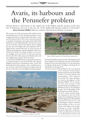 decorated with Minoan frescoes led to the hypothesis that Avaris might also be identified as the port of Perunefer, attested in texts and representations. For this discussion see: Bietak, EA 26, pp.13-17; Jeffreys, EA 28, pp.36-37; and Bietak, EA 34, pp.15-17. Recent research at Tell el-Daba by the Cairo Branch of the Austrian Archaeological Institute has focused on the possible locations of ancient harbours and mooring places. This is based on more than 800 auger drillings, an extensive geomagnetic survey (Forstner-MĂźller, EA 34, pp.1013) and, most recently, a VES (vertical electrical sounding) survey (Herbich, EA 41, p.12) undertaken to gain a better knowledge of the fluvial system and Nile branches. In 2013 a large research project was launched at the site of the supposed main harbour of Avaris, its location suggested by OSL (optically stimulated luminesence) and archaeological evidence obtained from boreholes. It lies in an area which is still visible in the modern landscape as a large, seasonallyinundated depression north-west of the excavation house and close to a modern Islamic cemetery, and