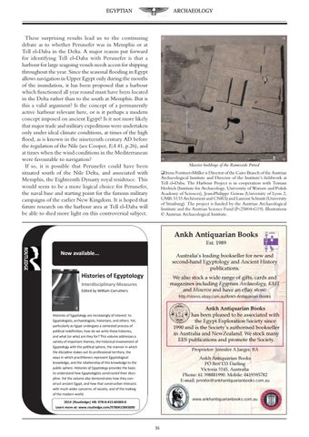 Massive buildings of the Ramesside Period q Irene Forstner-Müller is Director of the Cairo Branch of the Austrian Archaeological Institute and Director of the Institute’s fieldwork at Tell el-Daba. The Harbour Project is in cooperation with Tomasz Herbich (Institute for Archaeology, University of Warsaw and Polish Academy of Sciences), Jean-Philippe Goiran (University of Lyon 2, UMR 5133 Archéorient and CNRS) and Laurent Schmitt (University of Strasburg). The project is funded by the Austrian Archaeological Institute and the Austrian Science Fund (P-25804-G19). Illustrations © Austrian Archaeological Institute.