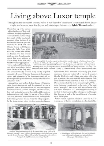 Living above Luxor temple Throughout the nineteenth century, before it was cleared of centuries of accumulated debris, Luxor temple was home to some flamboyant and picturesque characters, as Sylvie Weens describes. Perched on top of the ancient walls and columns of the temple at Luxor, two imposing houses dominated the nearby village for much of the nineteenth century. One belonged to the famous consular agent for initially the USA and later Britain, Russia and Belgium, Mustapha Agha Ayat, while the other, known as the Maison de France, was the official residence of the French consular agent. For many visitors to Luxor they were not only This photograph (the sky has been cropped) by Antonio Beato was taken from the roof of his own house and can their favourite stopping places - be dated to the 1850s, when Mustapha Agha was consular agent of the USA. The entrance to Mustapha’s house is between the columns of the Horemheb colonnade - note the flagpole in front of the house. The nearby court of where mail could be collected, and where lavish dinner parties Amenhotep III was used for storing wheat and was also the favourite abode of noisy camels which used to keep Lucie Duff Gordon awake at night. Photograph: DU1991.18 © Denison Museum, Denison University, Granville, Ohio were thrown - but they were with oriental food, musicians and dancing girls, stood also used unofficially to store many illicitly acquired mummies, stelae and baskets full of papyri, all acquired antiquities. It was well known that most of the consular illegally. While the small objects were often offered as agents took advantage of the immunity conferred by gifts to visitors, the more valuable and substantial finds their respectable positions to deal openly in the lucrative were sold to wealthy collectors as well as to museums. antiquities trade. One visitor recalled that his host was asking $1,000 for a Among these unscrupulous dealers, the case of Mustapha statue that stood conspicuously in the centre of the main Agha Ayat is famous and well documented: he was a room. Mustapha’s association with the infamous Abd generous host to British travellers and his name appears el-Rassoul brothers in 1871, following the discovery of in numerous travel accounts. Mustapha, a rich landowner, the Deir el-Bahri cache and the subsequent trial, brought had built his family house in the middle of Horemheb’s him disgrace as well as the loss of his role of consular colonnade in the early 1850s. He was one of the wealthiest agent for Belgium. and most influential personalities of Luxor, and regularly When French engineers arrived in Luxor in 1831 to helped the governor to deal with the village disputes. remove one of the two obelisks that stood in front of the In the sitting-room, where he often entertained guests