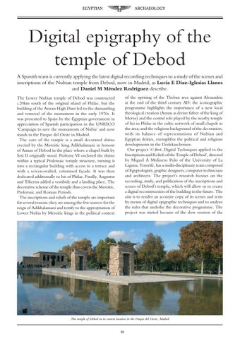 Digital epigraphy of the temple of Debod A Spanish team is currently applying the latest digital recording techniques to a study of the scenes and inscriptions of the Nubian temple from Debod, now in Madrid, as Lucía E Díaz-Iglesias Llanos and Daniel M Méndez Rodríguez describe. of the uprising of the Theban area against Alexandria at the end of the third century AD; the iconographic programme highlights the importance of a new local theological creation (Amun as divine father of the king of Meroe) and the central role played by the nearby temple of Isis in Philae in the cultic network of small chapels in the area; and the religious background of the decoration, with its balance of representations of Nubian and Egyptian deities, exemplifies the political and religious developments in the Dodekaschoinos. Our project ‘tA-Hwt, Digital Techniques applied to the Inscriptions and Reliefs of the Temple of Debod’, directed by Miguel Á Molinero Polo of the University of La Laguna, Tenerife, has a multi-disciplinary team composed of Egyptologists, graphic designers, computer technicians and architects. The project’s research focuses on the recording, study, and publication of the inscriptions and scenes of Debod’s temple, which will allow us to create a digital reconstruction of the building in the future. The aim is to render an accurate copy of its scenes and texts by means of digital epigraphic techniques and to analyze the rules that underlie the decorative programme. The project was started because of the slow erosion of the