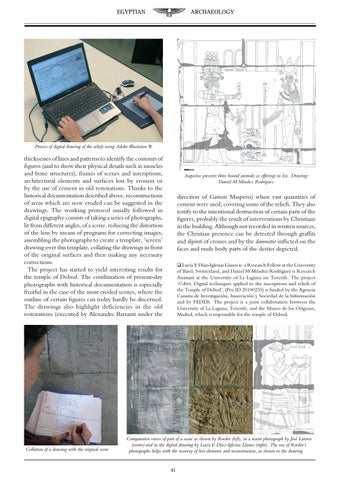 direction of Gaston Maspero) when vast quantities of cement were used, covering some of the reliefs. They also testify to the intentional destruction of certain parts of the figures, probably the result of interventions by Christians in the building. Although not recorded in written sources, the Christian presence can be detected through graffiti and dipinti of crosses and by the damnatio inflicted on the faces and nude body parts of the deities depicted. q Lucía E Díaz-Iglesias Llanos is a Research Fellow at the University of Basel, Switzerland, and Daniel M Méndez Rodríguez is Research Assistant at the University of La Laguna on Tenerife. The project ‘tA-Hwt, Digital techniques applied to the inscriptions and reliefs of the Temple of Debod’, (Pro ID 20100235) is funded by the Agencia Canaria de Investigación, Innovación y Sociedad de la Información and by FEDER. The project is a joint collaboration between the University of La Laguna, Tenerife, and the Museo de los Orígenes, Madrid, which is responsible for the temple of Debod.