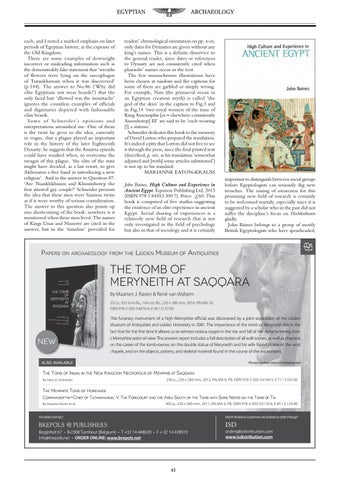 readers’ chronological orientation on pp. x-xi, only dates for Dynasties are given without any king’s names. This is a definite disservice to the general reader, since dates or references to Dynasty are not consistently cited when pharaohs’ names occur in the text. The few monochrome illustrations have been chosen at random and the captions for some of them are garbled or simply wrong. For example, Nun (the primaeval ocean in an Egyptian creation myth) is called ‘the god of the skies’ in the caption to Fig.3 and in Fig.14 ‘two royal women of the time of King Amenophis [sic – elsewhere consistently Amenhotep] III’ are said to be ‘each wearing [!] a sistrum’. Schneider dedicates this book to the memory of David Lorton who prepared the translation. It’s indeed a pity that Lorton did not live to see it through the press, since the final printed text (described, p. xiv, as his translation ‘somewhat adjusted and [with] some articles substituted’) is not up to his standard. MARIANNE EATON-KRAUSS John Baines, High Culture and Experience in Ancient Egypt. Equinox Publishing Ltd, 2013 (ISBN 978 1 84553 300 7). Price: £60. This book is comprised of five studies suggesting the existence of an elite experience in ancient Egypt. Social sharing of experiences is a relatively new field of research that is not only investigated in the field of psychology but also in that of sociology and it is certainly