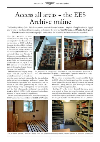 Access all areas - the EES Archive online The Society’s Lucy Gura Archive contains records from more than 130 years of exploration in Egypt and is one of the largest Egyptological archives in the world. Carl Graves and María Rodríguez Rubín describe the current project to rehouse the Archive and make it more accessible. The EES Archive includes information on the many sites investigated by the Society since its inception in 1882, including Amarna, Abydos and Deir el-Bahri. In addition to excavation records, it also contains material related to the associated Field Directors. One such individual was Ricardo A Caminos, a renowned Egyptologist and epigrapher who, together with Harry James and other colleagues, conducted work on behalf of the EES at the site of Gebel el-Silsila as part of the Archaeological Survey, between 1955 and 1982. At this isolated site roughly ninety Two photographs of the home of Ricardo Caminos before the Society purchased the house after his death in miles south of Luxor Caminos 1992. It was later dedicated as the Ricardo A Caminos Memorial Library, where much of the Lucy Gura Archive is now stored and preserved worked intensively to record and Mews, where he continued his research until his death copy the scenes and texts preserved at the site, including in 1992, when the Society purchased the property. His stelae, niches, rock-drawings and quarry marks. The home has since become the Society’s Ricardo A Caminos results of these expeditions were presented in Gebel esMemorial Library, which is open Monday to Friday for Silsilah, I: The Shrines, published by the EES in 1963. members and visiting researchers. Three volumes were contemplated, but unfortunately In May 2014, the Society decided that more space only the first volume, and a preliminary report of the was needed to house the ever increasing amount of work in JEA 41 (1955), 51-55, appeared, leaving large material in the Lucy Gura Archive – especially after the amounts of research material unpublished. recent arrival of records of the Society’s excavations in On his eventual retirement from Brown University in the Saqqara Sacred Animal Necropolis and of Caminos’ 1980, Caminos moved next door to the EES at 4 Doughty