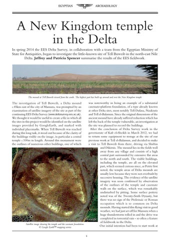 A New Kingdom temple in the Delta In spring 2014 the EES Delta Survey, in collaboration with a team from the Egyptian Ministry of State for Antiquities, began to investigate the little-known site of Tell Buweib in the north-east Nile Delta. Jeffrey and Patricia Spencer summarise the results of the EES fieldwork.