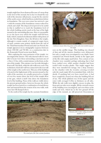 temple might have been destroyed because of a steep drop in the level of the mound, but in fact we found the rear wall of the structure still present, except for the exterior of the north corner, which had been eroded down below its foundation. The rear west corner has survived – just – with the remains of the foundation courses reduced to a brick and a half. The drop in level proved to be useful in that it enabled us to reach the foundation level of the whole building, pretty much at the base of the high mound in the surrounding flat zone. Here it was possible to see the layers over which the temple wall had been built, which consisted of settlement debris with pottery of the late New Kingdom. Since the fill above the temple, although it consists mainly of compacted empty layers of mud, contains some pottery sherds from the end of the Third Intermediate Period and early Late Period, the temple appears to sit in a stratigraphic sequence between about 1300 BC and 700 BC, so a construction date in the Ramesside Period seems most likely. After exploring the outer perimeter of the temple, we investigated the interior. The only internal walls we were able to locate were those surrounding a sanctuary area of c.24m x 13.5m, with a central entrance at the front, on the axis of the temple. This entrance was 2m wide through a front wall 2.9m thick, while the side walls were each 4.5m in thickness. Each side wall was connected to the rear wall of the temple at the north-west. This area of the building is located at the highest part of the ancient mound so the walls of the sanctuary are actually preserved to a height of over five metres above the level of the temple floor at the gate, which is itself 3.4m above the foundation level of the building. None of the walls are visible above the present ground surface, however, because the whole temple has been buried in a combination of wind-blown dust and material from the erosion of its own walls, with some later fill dumped above. To the south of the temple lay the casemate foundation