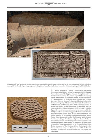 Excavation finds: lintel of Ramesses II from Area 200 (top; photograph by Dietrich Raue). Offering table of the priest Meryra found in Area 202 (above; photograph by M.Wenzel). Fragment of pottery vessel with depiction of a gazelle, probably Second Intermediate Period (below; photograph by M.-K. Schröder). Aiman Ashmawy is Director General of the Excavation Department in the Ministry of State for Antiquities (MAS). Dietrich Raue is Custodian of the Egyptian Museum – Georg Steindorff – of the University of Leipzig. The mission is grateful for the ongoing support of the German Archaeological Institute in Cairo, the Institute of Photogrammetry of the University of Stuttgart, the German University Cairo, the Austrian Archaeological Institute in Cairo, the Institute of Geography of the University of Ghent, the Polish Institute for Archaeology and Ethnology at the Polish Academy of Science in Warsaw. The project includes furthermore a cooperation with the project OrTempSol (Labex-Archimede, AAP 2, 2014, Axe 2 Pouvoirs: Espaces de pouvoirs et constructions territoriales, supported by the IFAO) and with the research training group ‘Kulturelle und technische Werte historischer Bauten’ at the BTU Cottbus-Senftenberg. The mission is funded by the Deutsche Forschungsgemeinschaft (DFG). Further financial support is owed to the Fondation Schiff-Giorgini, the Bertold-Leibinger Foundation and private donors. Parallel to the current excavation work, training courses for archaeological and epigraphical methods and techniques for members of the Inspectorate of Antiquities/Matariya were funded by the German Embassy Cairo. To the authorities of the Ministry of State for Antiquities, the Inspectorate of Matariya and the storerooms at Tell el-Hisn we would like to express our sincere thanks for their kind support and cooperation. 11
