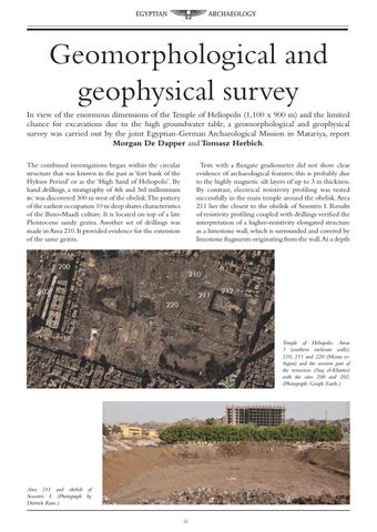 Geomorphological and geophysical survey In view of the enormous dimensions of the Temple of Heliopolis (1,100 x 900 m) and the limited chance for excavations due to the high groundwater table, a geomorphological and geophysical survey was carried out by the joint Egyptian-German Archaeological Mission in Matariya, report Morgan De Dapper and Tomasz Herbich. The combined investigations began within the circular structure that was known in the past as ‘fort bank of the Hyksos Period’ or as the ‘High Sand of Heliopolis’. By hand drillings, a stratigraphy of 4th and 3rd millennium bc was discovered 300 m west of the obelisk.The pottery of the earliest occupation 10 m deep shares characteristics of the Buto-Maadi culture. It is located on top of a late Pleistocene sandy gezira. Another set of drillings was made in Area 210. It provided evidence for the extension of the same gezira.