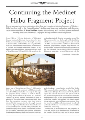 Continuing the Medinet Habu Fragment Project Despite a comprehensive reconstruction of the long and complex architectural sequence of MedinetHabu based on work by the Oriental Institute’s Architectural Survey, the study of the walled templecity remains unfinished. J. Brett McClain reports on continuing work on the fragments and small finds by the Oriental Institute’s Epigraphic Survey under W. Raymond Johnson. From 1926 to 1933, the University of Chicago’s Oriental Institute Architectural Survey, directed by Uvo Hölscher, systematically excavated the temple enclosure of Ramesses III at Medinet Habu. The data gathered by Hölscher’s team allowed a comprehensive reconstruction of the long and complex architectural sequence of the walled temple-city, published at an unprecedented level of detail between 1934 and 1954. Nevertheless, the