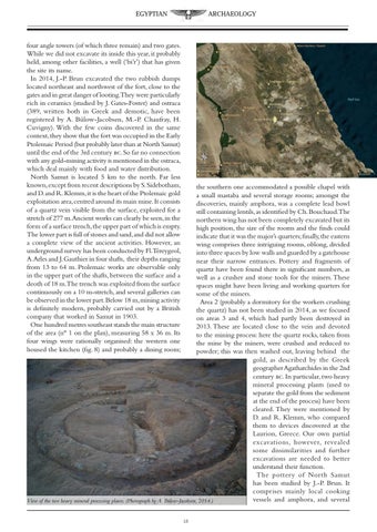 the southern one accommodated a possible chapel with a small mastaba and several storage rooms; amongst the discoveries, mainly amphora, was a complete lead bowl still containing lentils, as identified by Ch. Bouchaud.The northern wing has not been completely excavated but its high position, the size of the rooms and the finds could indicate that it was the major’s quarters; finally, the eastern wing comprises three intriguing rooms, oblong, divided into three spaces by low walls and guarded by a gatehouse near their narrow entrances. Pottery and fragments of quartz have been found there in significant numbers, as well as a crusher and stone tools for the miners. These spaces might have been living and working quarters for some of the miners. Area 2 (probably a dormitory for the workers crushing the quartz) has not been studied in 2014, as we focused on areas 3 and 4, which had partly been destroyed in 2013. These are located close to the vein and devoted to the mining process: here the quartz rocks, taken from the mine by the miners, were crushed and reduced to powder; this was then washed out, leaving behind the gold, as described by the Greek geographer Agatharchides in the 2nd century bc. In particular, two heavy mineral processing plants (used to separate the gold from the sediment at the end of the process) have been cleared. They were mentioned by D. and R. Klemm, who compared them to devices discovered at the Laurion, Greece. Our own partial excavations, however, revealed some dissimilarities and further excavations are needed to better understand their function. The pottery of North Samut has been studied by J.-P. Brun. It comprises mainly local cooking vessels and amphora, and several View of the two heavy mineral processing plants. (Photograph by A. Bülow-Jacobsen, 2014.) 18