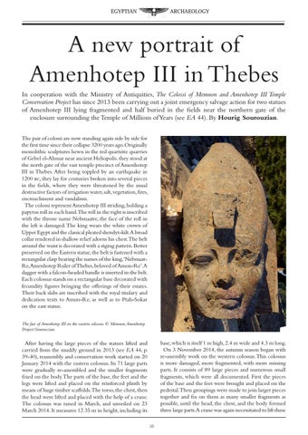 A new portrait of Amenhotep III in Thebes In cooperation with the Ministry of Antiquities, The Colossi of Memnon and Amenhotep III Temple Conservation Project has since 2013 been carrying out a joint emergency salvage action for two statues of Amenhotep III lying fragmented and half buried in the fields near the northern gate of the enclosure surrounding the Temple of Millions of Years (see EA 44). By Hourig Sourouzian. The pair of colossi are now standing again side by side for the first time since their collapse 3200 years ago. Originally monolithic sculptures hewn in the red quartzite quarries of Gebel el-Ahmar near ancient Heliopolis. they stood at the north gate of the vast temple precinct of Amenhotep III in Thebes. After being toppled by an earthquake in 1200 bc, they lay for centuries broken into several pieces in the fields, where they were threatened by the usual destructive factors of irrigation water, salt, vegetation, fires, encroachment and vandalism. The colossi represent Amenhotep III striding, holding a papyrus roll in each hand.The roll in the right is inscribed with the throne name Nebmaatre, the face of the roll in the left is damaged. The king wears the white crown of Upper Egypt and the classical pleated shendyt-kilt.A broad collar rendered in shallow relief adorns his chest.The belt around the waist is decorated with a zigzag pattern. Better preserved on the Eastern statue, the belt is fastened with a rectangular clasp bearing the names of the king,‘NebmaatRe,Amenhotep Ruler of Thebes, beloved of Amon-Re’.A dagger with a falcon-headed handle is inserted in the belt. Each colossus stands on a rectangular base decorated with fecundity figures bringing the offerings of their estates. Their back slabs are inscribed with the royal titulary and dedication texts to Amun-Re, as well as to Ptah-Sokar on the east statue. The face of Amenhotep III on the eastern colossus. Š Memnon Amenhotep Project/Sourouzian.